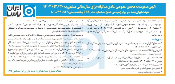 بدینوسیله از کلیه سهامداران محترم شرکت ایران یاسا تایر و رابر و یا نمایندگان قانونی آنها دعوت می شود تا در جلسه مجمع عمومی عادی سالیانه برای سال مالی منتهی به سی ام اسفندماه 1403، راس ساعت 9:00 صبح روز سه شنبه مورخ سیزدهم خردادماه 1404 در محل تهران – جنب درب غربي استاديوم آزادي – هتل المپيک – سالن هگمتانه برگزار می شود، حضور به هم رسانند.