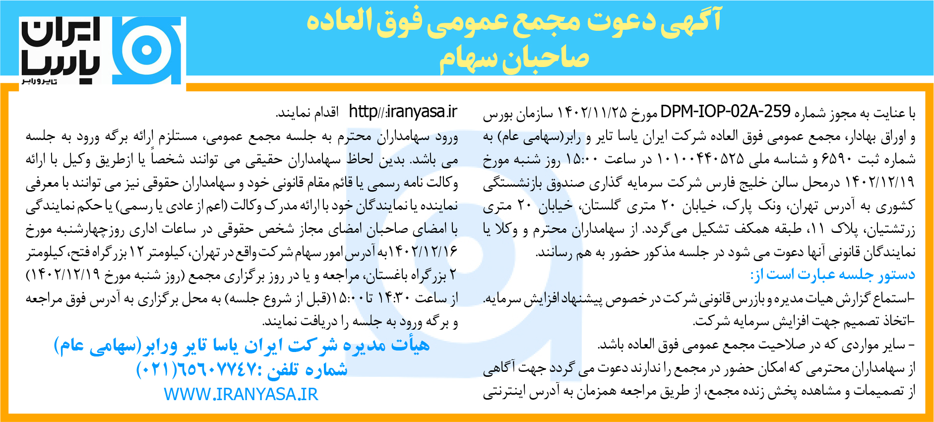 با عنایت به مجوز شماره DPM-IOP-02A-259مورخ 25/11/1402 سازمان بورس واوراق بهادار، مجمع عمومی فوق العاده شرکت ایران یاسا تایر ورابر(سهامی عام) به شماره ثبت 6590 و شناسه ملی 10100440525 در ساعت 15:00 روز شنبه مورخ 19/12/1402 درمحل سالن خلیج فارس شرکت سرمایه گذاری صندوق بازنشستگی کشوری به آدرس تهران ونک پارک خیابان 20 متری گلستان خیابان 20 متری زرتشتیان پلاک 11 طبقه همکف تشکیل میگردد.