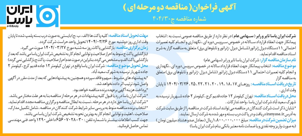 شرکت ایران یاسا تایر و رابر ( سهامی عام ) در نظر دارد از طريق مناقصه عمومي نسبت به انتخاب پیمانکار به منظور انعقاد قرارداد سالانه در خصوص سرویس دوره ای ، نگهداری و انجام تمامی تعمیرات احتمالی 11 دستگاه دیزل ژنراتور ( شامل دیزل -ژنراتور و تابلوهای برق) متعلق به مناقصه گزار به شرح اسناد مناقصه اقدام کند.