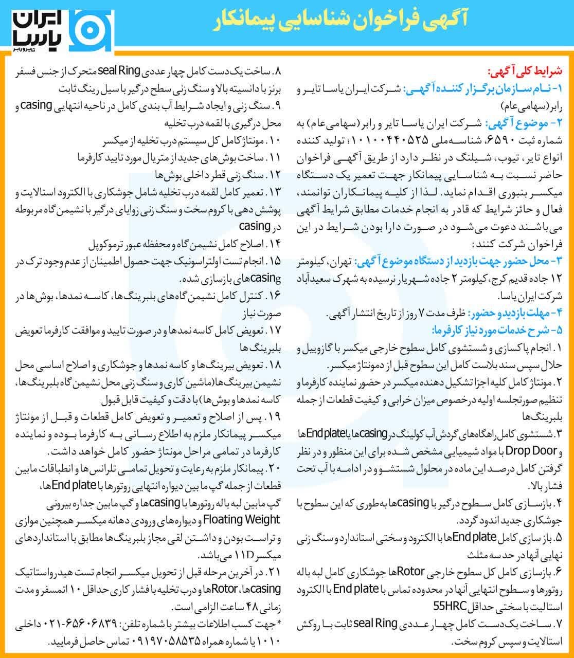 شرکت ایران یاسا تایر و رابر ( سهامی عام ) به شماره ثبت 6590 ، شناسه ملي 10100440525 ؛  تولید کننده انواع تایر، تیوب و شیلنگ در نظر دارد از طريق انتشار آگهی فراخوان نسبت به شناسایی پیمانکار برای تعمیر یک دستگاه میکسر بنبوری اقدام کند، لذا از تمامی پیمانکاران توانمند، فعال و واجد شرایط که قادر به انجام خدمات مطابق شرایط آگهی باشند، دعوت می شود در صورت دارا بودن شرایط در این فراخوان شرکت کنند.