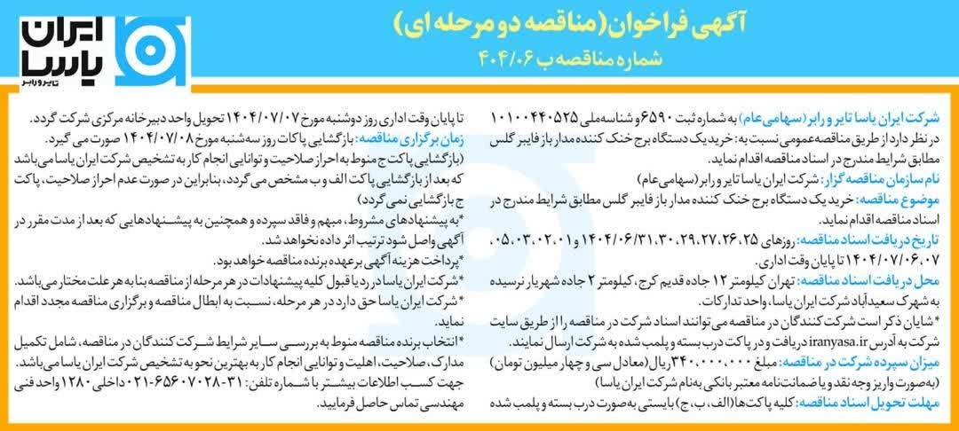 شرکت ایران یاسا تایر و رابر ( سهامی عام ) به شماره ثبت 6590 و شناسه ملی 10100440525 در نظر دارد از طريق مناقصه عمومي نسبت به خرید یک دستگاه برج خنک کننده مدار باز فایبر گلس مطابق شرایط مندرج در اسناد مناقصه اقدام کند.