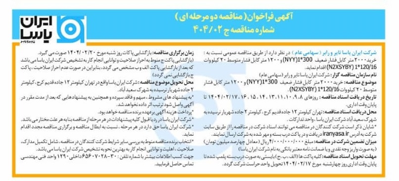 شرکت ایران یاسا تایر و رابر ( سهامی عام ) در نظر دارد از طريق مناقصه عمومي نسبت به خرید 2000 متر کابل فشار ضعیف  (NYY)1*300 و 1200 متر کابل فشار متوسط 20 کیلو وات1*120/16(N2XSYBY) اقدام کند.