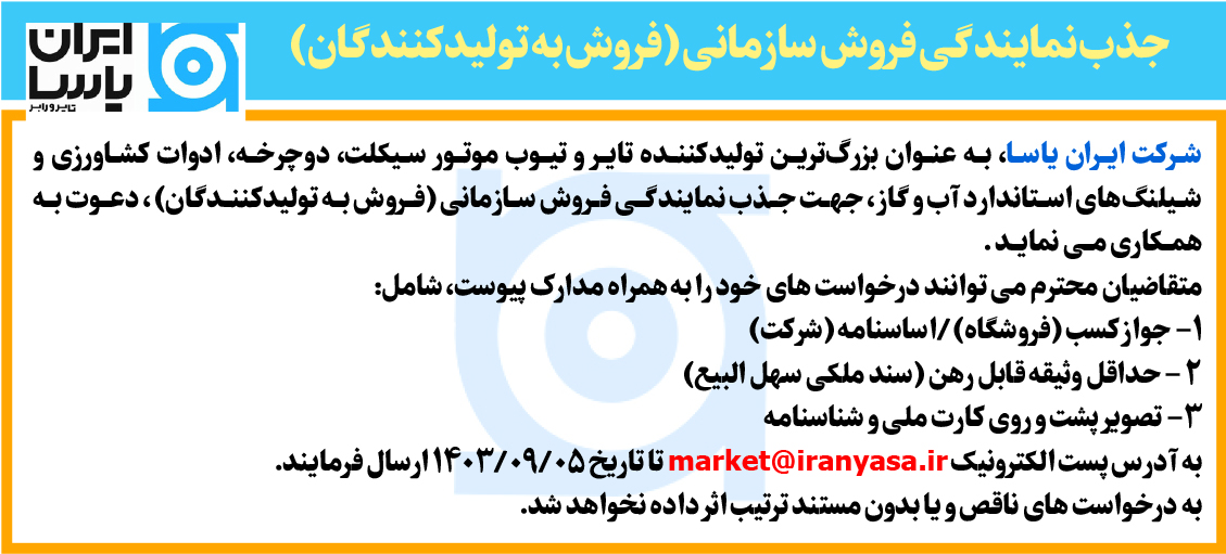 شرکت ایران یاسا، به عنوان بزرگترین تولیدکننده تایر و تیوب موتورسیکلت، دوچرخه، ادوات کشاورزی و شیلنگهای استاندارد آب و گاز، جهت جذب نمایندگی فروش سازمانی (فروش به تولیدکنندگان)، دعوت به همکاری مینماید.