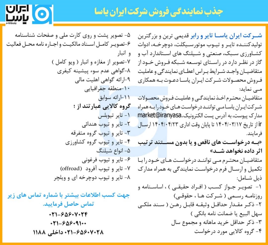 شرکت ایران یاسا تایر و رابر قدیمی ترین و بزرگترین تولیدکننده تایر و تیوب موتورسیکلت، دوچرخه، ادوات کشاورزی سبک، صنعتی و شیلنگ های استاندارد آب و گاز، به منظور توسعه شبکه فروش خود از متقاضیان واجد شرایط براس اعطای نمایندگی و عاملیت فروش محصولات شرکت ایران یاسا دعوت به همکاری می کند.