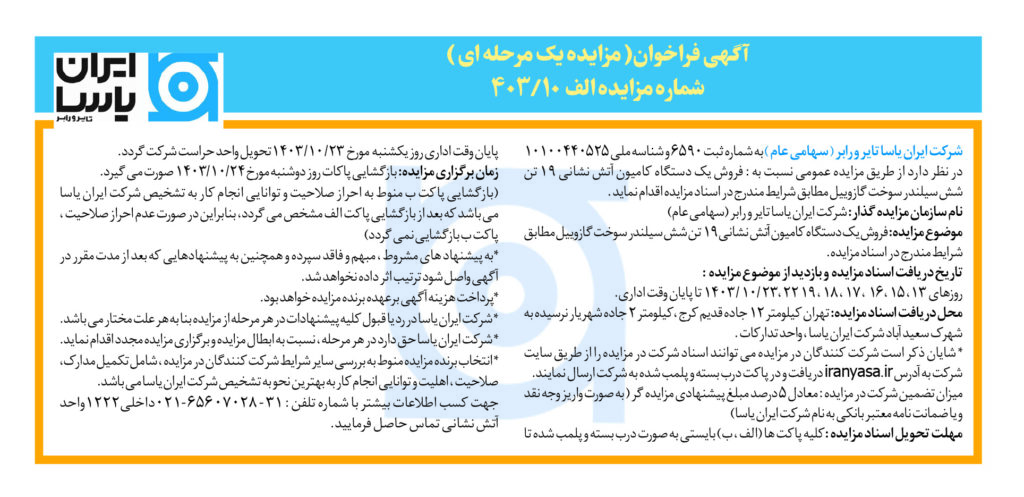 شرکت ایران یاسا تایر و رابر ( سهامی عام ) به شماره ثبت 6590 و شناسه ملی 10100440525 در نظر دارد از طريق مزایده عمومي نسبت به : فروش یک دستگاه کامیون آتش نشانی 19 تن شش سیلندر سوخت گازوییل مطابق شرایط مندرج در اسناد مزایده اقدام نماید .