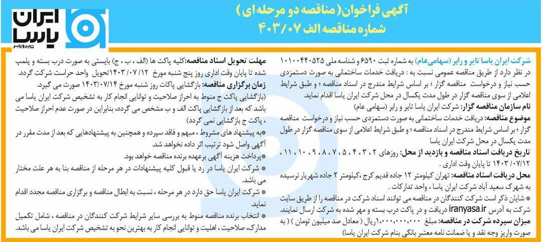 شرکت ایران یاسا تایر و رابر ( سهامی عام ) به شماره ثبت 6590 و شناسه ملی 10100440525در نظر دارد از طريق مناقصه عمومي نسبت به : دریافت خدمات ساختمانی به صورت دستمزدی حسب نیاز و درخواست مناقصه گزار؛ براساس جدول پیوست شماره 1؛ و طبق شرایط اعلامی از سوی مناقصهگذار در طول مدت یکسال اقدام نماید.