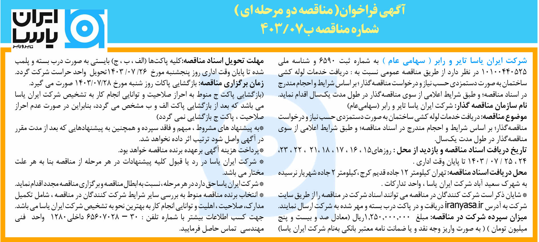 شرکت ایران یاسا تایر و رابر ( سهامی عام ) به شماره ثبت  6590 و شناسه ملی 10100440525در نظر دارد از طريق مناقصه عمومي نسبت به : دریافت خدمات لوله کشی ساختمان به صورت دستمزدی حسب نیاز و درخواست مناقصه‌گذار؛ براساس شرایط و احجام مندرج در اسناد مناقصه؛ و طبق شرایط اعلامی از سوی مناقصه‌گذار در طول مدت یک‌سال اقدام نماید.