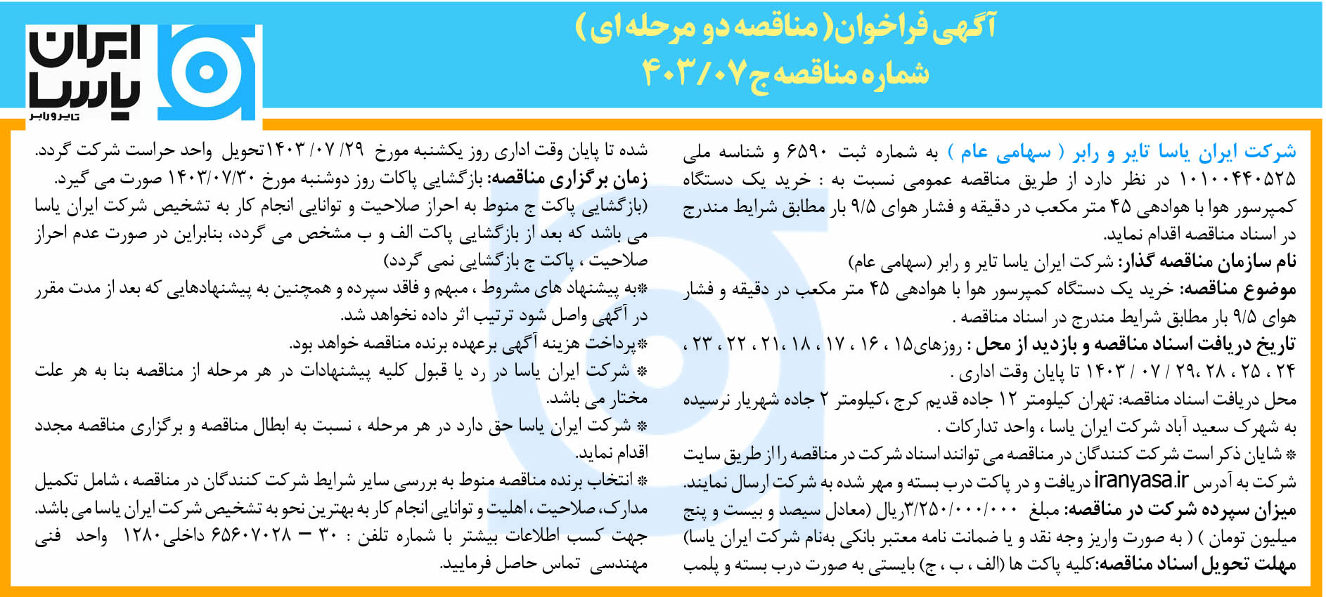 شرکت ایران یاسا تایر و رابر ( سهامی عام ) به شماره ثبت  6590 و شناسه ملی 10100440525در نظر دارد از طريق مناقصه عمومي نسبت به : خرید یک دستگاه کمپرسور هوا با هوادهی 45 متر مکعب در دقیقه و فشار هوای 9/5 بار مطابق شرایط مندرج در اسناد مناقصه اقدام نماید.
