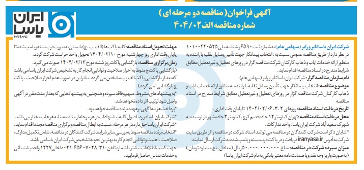 شرکت ایران یاسا تایر و رابر ( سهامی عام ) به شماره ثبت 6590 و شناسه ملی 10100440525 در نظر دارد از طريق مناقصه عمومي نسبت به انتخاب پیمانکار برای تأمين وسایل نقلیه با راننده به منظور ارائه خدمات اياب و ذهاب کارکنان شرکت مناقصه گزار در روزهاي تعطيل و غيرتعطيل مطابق شرایط مندرج در اسناد مناقصه اقدام کند.