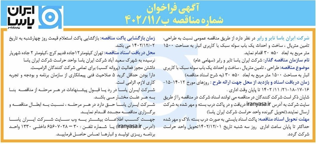 شرکت ایران یاسا تایر و رابر ( سهامی عام ) در نظر دارد از طريق مناقصه عمومي نسبت به طراحی ، تامین متریال ، ساخت و احداث یک باب سوله سبک با كاربري انبار به مساحت ١٥٠٠ متر مربع به ابعاد ٥٠* ٣0 اقدام نماید.